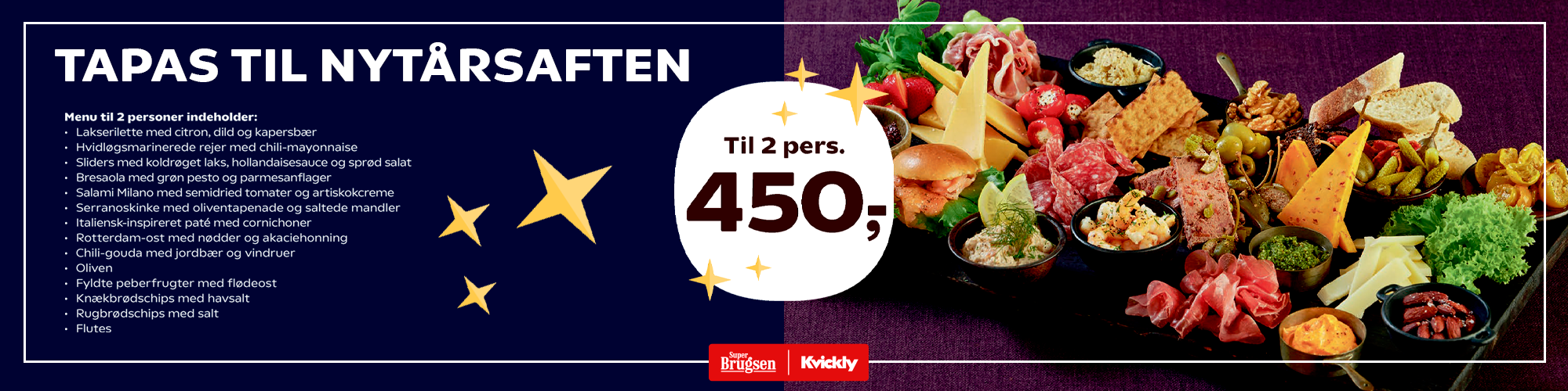 Tapas kan varierer, men kan fx være spansk/italiensk pålæg ,salami snacks, ailo, pesto,pete, brie, oliven, hvidløg, pynt med mere. Klar lige til at servere!